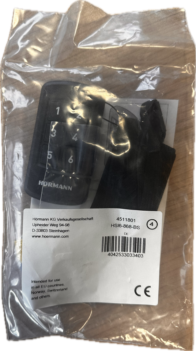 Der Industrie-Handsender HSI 6 868-BS kann für die Bedienung von bis zu sechs Empfängern verwendet werden. Gefertigt wurde der Handsender für die neuen Antriebe Generationen 3 und 4, die mit dem Funkstandard 868 MHz BiSecur ausgestattet sind. Mit dem Transmitter lassen sich aber auch Antriebe der Generation 1 und 2 mit dem älteren Funkstandard 868 MHz Festcode bedienen. Der HSI 6 868-BS kann aufgrund seiner geringen Maße sehr gut am Gürtel befestigt werden, sodass er stets griffbereit ist. Auch ein Umhängeband zur Verwendung am Körper ist für diesen kleinen Handsender erhältlich. Sowohl der Gürtelclip als auch das Umhängeband sind bereits im Lieferumfang enthalten.